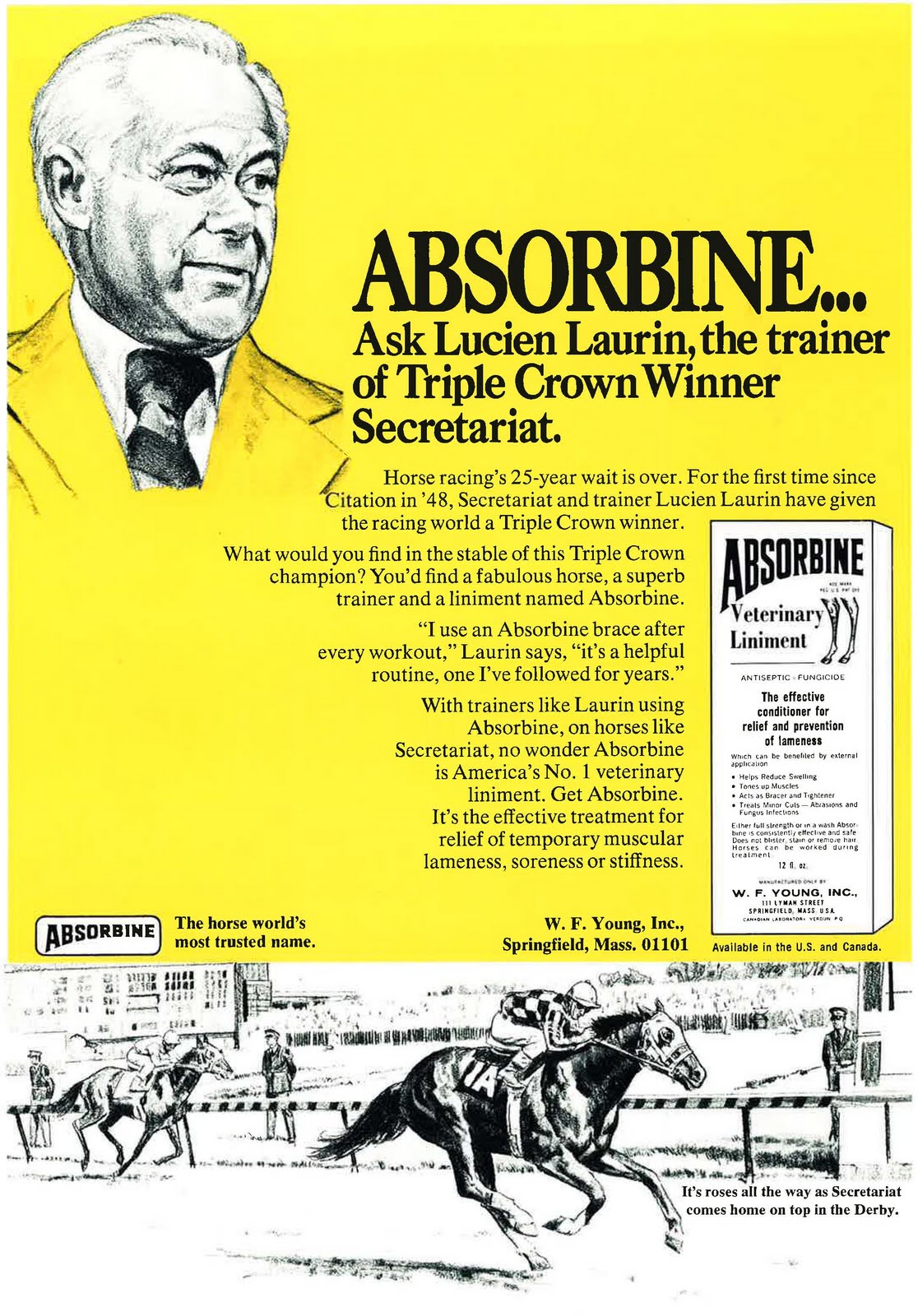 Lucien Lauren was the world famous trainer of Secretariat, infamous winner of the Triple Crown in 1973. We dug through our archives and found this advertisement from 1973 featuring Lucien Lauren, Secretariat and everyone’s favorite, Absorbine® Veterinary Liniment. The Disney movie Secretariat arrives in theaters October8. The Official Trailer: http://trailers.apple.com/trailers/disney/secretariat/